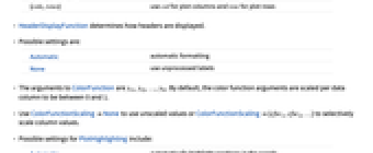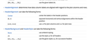 None leave the plot columns and rows unlabeled Automatic automatically label columns and rows All always include column and row labels "Indexed" number the columns and rows 1, 2, …, n {lbl1,lbl2,…,lbln} use the given labels lbli - HeaderAlignment determines how data column labels are aligned with regard to the plot columns and rows.