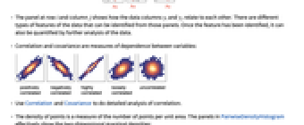 shows how the data columns yi and yj relate to each other. There are different types of features of the data that can be identified from those panels. Once the feature has been identified, it can also be quantified by further analysis of the data. - Correlation and covariance are measures of dependence between variables: