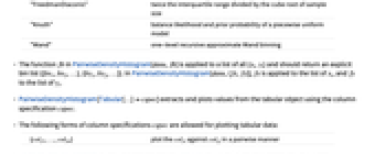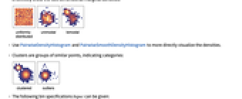 "Sturges" compute the number of bins based on the length of data "Scott" asymptotically minimize the mean square error "FreedmanDiaconis" twice the interquartile range divided by the cube root of sample size "Knuth" balance likelihood and prior probability of a piecewise uniform model "Wand" one-level recursive approximate Wand binning - The function fb in PairwiseDensityHistogram[data,fb] is applied to a list of all {xi,yi} and should return an explicit bin list {{bx1,bx2,…},{by1,by2,…}}. In PairwiseDensityHistogram[data,{fx,fy}], fx is applied to the list of xi, and fy to the list of yi.