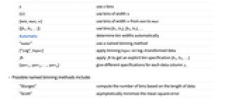 n use n bins {w} use bins of width w {min,max,w} use bins of width w from min to max {{b1,b2,…}} use bins [b1,b2),[b2,b3),… Automatic determine bin widths automatically "name" use a named binning method {"Log",bspec} apply binning bspec on log-transformed data fb apply fb to get an explicit bin specification {b1,b2,…} {spec1,spec2,…,specn} give different specifications for each data column yi - Possible named binning methods include:
