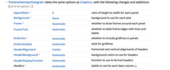 AlignmentPoint Center the default point in the graphic to align with AspectRatio 1 ratio of height to width for each panel Axes False whether to draw axes AxesLabel None axes labels AxesOrigin Automatic where axes should cross AxesStyle {} style specifications for the axes Background None background to use for each plot BaselinePosition Automatic how to align with a surrounding text baseline BaseStyle {} base style specifications for the graphic ContentSelectable Automatic whether to allow contents to be selected CoordinatesToolOptions Automatic detailed behavior of the coordinates tool Epilog {} primitives rendered after the main plot FormatType TraditionalForm the default format type for text Frame Automatic whether to draw frames around each panel FrameLabel None frame labels FrameStyle {} style specifications for the frame FrameTicks Automatic whether to label frame edges with ticks and labels FrameTicksStyle {} style specifications for frame ticks GridLines Automatic whether to include gridlines in panels GridLinesStyle Automatic style for gridlines HeaderAlignment Center horizontal and vertical alignments of headers HeaderBackground Automatic background colors to use for headers HeaderDisplayFunction Automatic function to use to format headers Headers Automatic labels to use for each data column yi HeaderStyle None styles to use for headers ImageMargins 0. the margins to leave around the graphic ImagePadding All what extra padding to allow for labels etc. ImageSize Automatic the absolute size at which to render the graphic LabelStyle {} style specifications for labels Method Automatic details of graphics methods to use PerformanceGoal $PerformanceGoal aspects of performance to try to optimize PlotHighlighting Automatic highlighting effect for points PlotLabel None an overall label for the plot PlotLayout Automatic how to arrange the panels PlotLegends Automatic legends for data PlotMarkers None markers to use to indicate each point PlotRange All range of values to include PlotRangeClipping False whether to clip at the plot range PlotRangePadding Automatic how much to pad the range of values PlotRegion Automatic the final display region to be filled PlotStyle Automatic graphics directives to determine styles of points PlotTheme $PlotTheme overall theme for the plot PreserveImageOptions Automatic whether to preserve image options when displaying new versions of the same graphic Prolog {} primitives rendered before the main plot RotateLabel True whether to rotate y labels on the frame Spacings Automatic horizontal and vertical spacings Ticks Automatic axes ticks TicksStyle {} style specifications for axes ticks