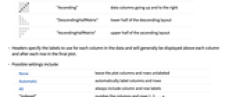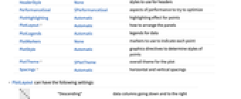 AspectRatio 1 ratio of height to width for each panel Background None background to use for each plot Frame Automatic whether to draw frames around each panel FrameTicks Automatic whether to label frame edges with ticks and labels GridLines Automatic whether to include gridlines in panels GridLinesStyle Automatic style for gridlines HeaderAlignment Center horizontal and vertical alignments of headers HeaderBackground Automatic background colors to use for headers HeaderDisplayFunction Automatic function to use to format headers Headers Automatic labels to use for each data column yi HeaderStyle None styles to use for headers PerformanceGoal $PerformanceGoal aspects of performance to try to optimize PlotHighlighting Automatic highlighting effect for points PlotLayout Automatic how to arrange the panels PlotLegends Automatic legends for data PlotMarkers None markers to use to indicate each point PlotStyle Automatic graphics directives to determine styles of points PlotTheme $PlotTheme overall theme for the plot Spacings Automatic horizontal and vertical spacings - PlotLayout can have the following settings: