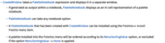 - CreateWindow takes a PaletteNotebook expression and displays it in a separate window.
