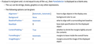 Alignment {Automatic,Automatic} how to align objects in the display area Background None background color to use BaselinePosition Automatic what to align with a surrounding text baseline BaseStyle {} base style specifications for the displayed object ContentPadding True whether to shrink the margins tightly around the contents FrameMargins Automatic margins to leave inside the overall frame ImageMargins 0 margins around the image of the displayed object ImageSize All the overall image size for the displayed object TransitionDirection Left the direction for sweeping or wiping transitions TransitionDuration 0.5 duration in seconds of the visual effect used for switching panes TransitionEffect None visual effect to use when switching panes - With the default option setting ImageSize->All, PaneSelector always leaves space for the largest of the expri to be displayed, so that its overall size does not change.