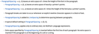 - ParagraphSpacing->{c,n} leaves an extra space of c times the height of the font plus n printer’s points.