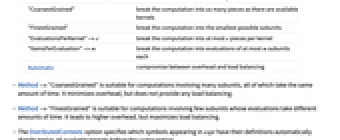 "CoarsestGrained" break the computation into as many pieces as there are available kernels "FinestGrained" break the computation into the smallest possible subunits "EvaluationsPerKernel"->e break the computation into at most e pieces per kernel "ItemsPerEvaluation"->m break the computation into evaluations of at most m subunits each Automatic compromise between overhead and load balancing - Method->"CoarsestGrained" is suitable for computations involving many subunits, all of which take the same amount of time. It minimizes overhead, but does not provide any load balancing.