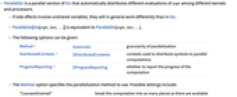 Method Automatic granularity of parallelization DistributedContexts $DistributedContexts contexts used to distribute symbols to parallel computations ProgressReporting $ProgressReporting whether to report the progress of the computation - The Method option specifies the parallelization method to use. Possible settings include: