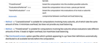"CoarsestGrained" break the computation into as many pieces as there are available kernels "FinestGrained" break the computation into the smallest possible subunits "EvaluationsPerKernel"->e break the computation into at most e pieces per kernel "ItemsPerEvaluation"->m break the computation into evaluations of at most m subunits each Automatic compromise between overhead and load balancing - Method->"CoarsestGrained" is suitable for computations involving many subunits, all of which take the same amount of time. It minimizes overhead, but does not provide any load balancing.