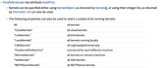- Kernels can be specified either using KernelObject, as returned by Kernels[], or using their integer IDs, as returned by $KernelID. All can also be used.