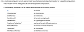 All all kernels "CloudKernels" all cloud kernels "LinkKernels" all link kernels "LocalKernels" all kernels running locally "LWGKernels" all LightweightGrid kernels "OneKernelPerMachine" one kernel for each different machine "RemoteKernels" all kernels on remote machines "SshKernels" all SSH kernels "WSTPServerKernels" all WSTPServer kernels