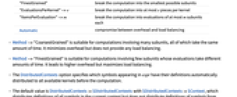 "CoarsestGrained" break the computation into as many pieces as there are available kernels "FinestGrained" break the computation into the smallest possible subunits "EvaluationsPerKernel"->e break the computation into at most e pieces per kernel "ItemsPerEvaluation"->m break the computation into evaluations of at most m subunits each Automatic compromise between overhead and load balancing - Method->"CoarsestGrained" is suitable for computations involving many subunits, all of which take the same amount of time. It minimizes overhead but does not provide any load balancing.