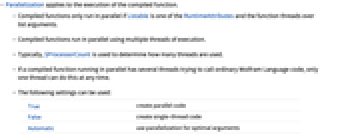 - If a compiled function running in parallel has several threads trying to call ordinary Wolfram Language code, only one thread can do this at any time.