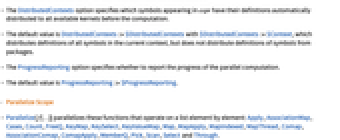 - The DistributedContexts option specifies which symbols appearing in expr have their definitions automatically distributed to all available kernels before the computation.