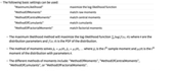 . - The different methods of moments include: "MethodOfMoments", "MethodOfCentralMoments", "MethodOfCumulants", or "MethodOfFactorialMoments".