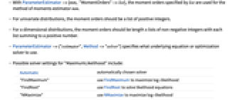 - With ParameterEstimator->{mm, "MomentOrders"->list}, the moment orders specified by list are used for the method of moments estimator mm.