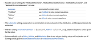 Automatic automatically chosen solver "FindRoot" use FindRoot to solve moment equations "NSolve" use NSolve to solve moment equations "Solve" use Solve to solve moment equations - The Automatic setting uses a solver or combination of solvers based on the distribution and the parameters to be estimated.