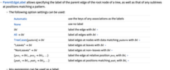 - ParentEdgeLabel allows specifying the label of the parent edge of the root node of a tree, as well as that of any subtrees at positions matching a pattern.