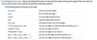 Automatic use the automatic shape None do not render the edge » "name" a named edge shape function » func a general edge shape function Allfunc use shape function func for all edges » TreeCases[pattern]func use func for edges at nodes with data matching pattern » "Leaves"func use func for edges at leaves » "NonLeaves"func use func for edges at non-leaves » {pos1func1,pos2func2,…} use funci for the edge at relative position posi » {patt1func1,patt2func2,…} use funci for edges at positions matching patti » - Edge style specifications are effectively applied in the order ParentEdgeStyle, ParentEdgeStyleFunction and ParentEdgeShapeFunction, with later specifications overriding the earlier ones.