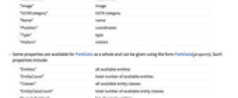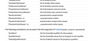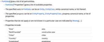 "Entities" all available entities "EntityCount" total number of available entities "Classes" all available entity classes "EntityClassCount" total number of available entity classes "SampleEntities" list of sample entities "SampleEntityClasses" list of sample entity classes "EntityCanonicalNames" list of all entity canonical names "PropertyCanonicalNames" list of all property canonical names "EntityClassCanonicalNames" list of all entity class canonical names "RandomEntities" pseudorandom sample entities {"RandomEntities",n} n pseudorandom entities "RandomEntityClasses" pseudorandom sample entity classes {"RandomEntityClasses",n} n pseudorandom entity classes - The following annotations can be used in the third argument of ParkData[entity,property,annotation]: