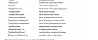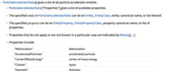 "Entities" all available entities "EntityCount" total number of available entities "Classes" all available entity classes "EntityClassCount" total number of available entity classes "SampleEntities" list of sample entities "SampleEntityClasses" list of sample entity classes "EntityCanonicalNames" list of all entity canonical names "PropertyCanonicalNames" list of all property canonical names "EntityClassCanonicalNames" list of all entity class canonical names "RandomEntities" pseudorandom sample entities {"RandomEntities",n} n pseudorandom entities "RandomEntityClasses" pseudorandom sample entity classes {"RandomEntityClasses",n} n pseudorandom entity classes - The following annotations can be used in the third argument of ParticleAcceleratorData[entity,property,annotation]:
