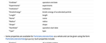 "Abbreviation" abbreviation "AcceleratedParticles" accelerated particles "CenterOfMassEnergy" center‐of‐mass energy "Classes" types "Diameter" diameter "EndDate" operation end date "Experiments" experiments "Institution" institution "KineticEnergy" kinetic energy of accelerated particle "Length" length "Name" name "Radius" radius "Shape" shape "StartDate" operation start date "Type" type - Some properties are available for ParticleAcceleratorData as a whole and can be given using the form ParticleAcceleratorData[property]. Such properties include: