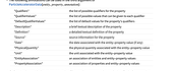"Qualifiers" the list of possible qualifiers for the property "QualifierValues" the list of possible values that can be given to each qualifier "DefaultQualifierValues" the list of default values for the property's qualifiers "Description" a brief textual description of the property "Definition" a detailed textual definition of the property "Source" source information for the property "Date" the date associated with the entity-property value (if any) "PhysicalQuantity" the physical quantity associated with the entity-property value "Unit" the unit associated with the entity-property value "EntityAssociation" an association of entities and entity-property values "PropertyAssociation" an association of properties and entity-property values - If a function is provided as an annotation, it will be used to aggregate the result data. Typical aggregation functions include: