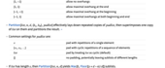 x pad with repetitions of a single element {x1,x2,…} pad with cyclic repetitions of a sequence of elements list pad by treating list as cyclic (default) {} no padding, potentially leaving sublists of different lengths - If list has length s, then Partition[list,n,d] yields Max[0,Floor[(s+d-n)/d]] sublists.