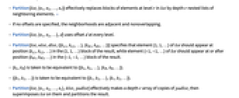 - Partition[list,nlist,dlist,{{kL 1,kL 2,…},{kR 1,kR 2,…}}] specifies that element {1,1,…} of list should appear at position {kL 1,kL 2,…} in the {1,1,…} block of the result, while element {-1,-1,…} of list should appear at or after position {kR 1,kR 2,…} in the {-1,-1,…} block of the result.