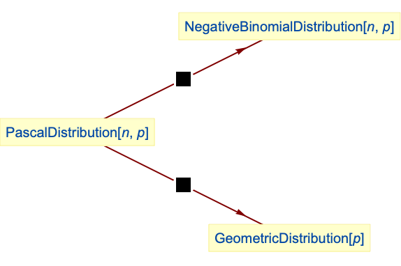 - PascalDistribution is related to a number of other statistical distributions. As mentioned above, it is a member of the family of negative binomial distributions and hence is qualitatively related to NegativeBinomialDistribution (also known as Pólya distribution for noninteger n). GeometricDistribution is a transformation (TransformedDistribution) of PascalDistribution in that the CDF of the variate u-1 is precisely that of GeometricDistribution[p] whenever uPascalDistribution[1,p]. PascalDistribution is also a transformation of NegativeBinomialDistribution, while the PDF of PascalDistribution[n,p] converges to that of NormalDistribution[μ,σ] as n→∞ for μ and σ the mean (Mean) and standard deviation (StandardDeviation), respectively, of PascalDistribution[n,p]. PascalDistribution is also related to PoissonDistribution, PoissonConsulDistribution, BinomialDistribution, NegativeBinomialDistribution, MultinomialDistribution, and NegativeMultinomialDistribution.