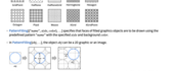 - PatternFilling[{"name",style,color},…] specifies that faces of filled graphics objects are to be drawn using the predefined pattern "name" with the specified style and background color.