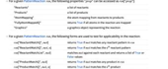 "Reactants" a list of reactants "Products" a list of products "AtomMapping" the atom mapping from reactants to products "FullyAtomMappedQ" returns True if all atoms in the reaction are mapped "Graphics" a graphics object representing the reaction - For a given PatternReaction rxn, the following forms are used to test for applicability in the reaction: