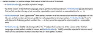 - A perfect number is a positive integer that is equal to half the sum of its divisors.