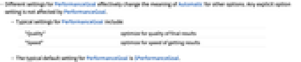 - Different settings for PerformanceGoal effectively change the meaning of Automatic for other options. Any explicit option setting is not affected by PerformanceGoal.