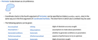 - Coordinate charts in the fourth argument of Perimeter can be specified as triples {coordsys,metric,dim} in the same way as in the first argument of CoordinateChartData. The short form in which dim is omitted may be used.