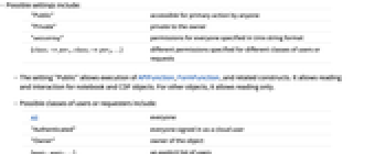 "Public" accessible for primary action by anyone "Private" private to the owner "unixstring" permissions for everyone specified in Unix string format {class1->per1,class2->per2,…} different permissions specified for different classes of users or requests - The setting "Public" allows execution of APIFunction, FormFunction, and related constructs. It allows reading and interaction for notebook and CDF objects. For other objects, it allows reading only.