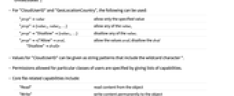 "prop"value allow only the specified value "prop"{value1,value2,…} allow any of the valuei "prop""Disallow"{value1,…} disallow any of the valuei "prop"<|"Allow"aval,"Disallow"dval|> allow the values aval; disallow the dval - Values for "CloudUserID" can be given as string patterns that include the wildcard character *.