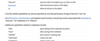 "Read" read content from the object "Write" write content permanently to the object "Execute" execute code in the object (e.g. via a form or API) Automatic allow the primary action on the object All allow all actions on the object - Core file-related capabilities can also be specified as Unix-like permissions strings of the form "rwx" etc.
