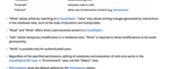 "Edit" allow editing of the notebook document "Save" allow saving of the notebook "CellEdit" edit content in existing cells "CellCreate" create new cells "CellDelete" delete existing cells "Evaluate" evaluate code in cells "Interact" allow use of interactive content (e.g. Manipulate) - "Write" allows arbitrary rewriting of a CloudObject. "Save" only allows writing changes generated by interactions in the notebook view, such as the state of dynamics and manipulates.