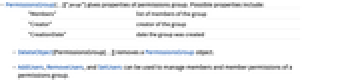 - PermissionsGroup[…]["prop"] gives properties of permissions group. Possible properties include: