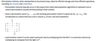 - Permutation matrices, when represented as structured arrays, allow for efficient storage and more efficient operations, including Det, Inverse and LinearSolve.