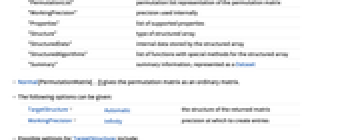 "PermutationCycles" disjoint cycle representation of the permutation matrix "PermutationList" permutation list representation of the permutation matrix "WorkingPrecision" precision used internally "Properties" list of supported properties "Structure" type of structured array "StructuredData" internal data stored by the structured array "StructuredAlgorithms" list of functions with special methods for the structured array "Summary" summary information, represented as a Dataset - Normal[PermutationMatrix[…]] gives the permutation matrix as an ordinary matrix.