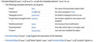 "Value" Null the value of the persistent object itself "HeldValue" Hold[Null] the value wrapped in Hold "MergingFunction" Automatic the default merging function to use "ValuePreprocessingFunction" Identity the function applied to new values to be assigned "ModificationDate" None time stamp of last modification "ExpirationDate" None time after which data is no longer used "Creator" $Username user who last modified the object - PersistentObject["name",loc][All] gives the association of all metadata.
