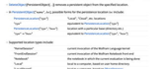 PersistenceLocation["type"] "Local", "Cloud", etc. locations "type" equivalent to PersistenceLocation["type"] PersistenceLocation["type","base"] location with a particular base (directory etc.) "type""base" equivalent to PersistenceLocation["type","base"] - Supported location types include: