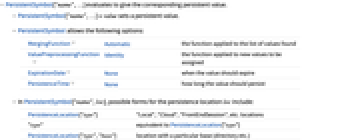 MergingFunction Automatic the function applied to the list of values found ValuePreprocessingFunction Identity the function applied to new values to be assigned ExpirationDate None when the value should expire PersistenceTime None how long the value should persist - In PersistentSymbol["name",loc], possible forms for the persistence location loc include:
