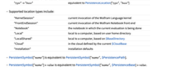 PersistenceLocation["type"] "Local", "Cloud", "FrontEndSession", etc. locations "type" equivalent to PersistenceLocation["type"] PersistenceLocation["type","base"] location with a particular base (directory etc.) "type""base" equivalent to PersistenceLocation["type","base"] - Supported location types include: