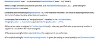 - When a single persistence location is specified, as in PersistentSymbol["name",loc,…], the setting for MergingFunction is not used.