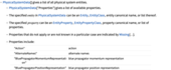 - PhysicalSystemData["Properties"] gives a list of available properties.