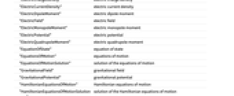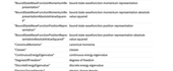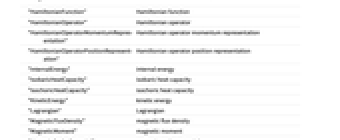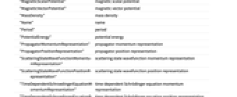 "Action" action "AlternateNames" alternate names "BluePropagatorMomentumRepresentation" blue propagator momentum representation "BluePropagatorPositionRepresentation" blue propagator position representation "BoundStateWaveFunctionMomentumRepresentation" bound state wavefunction momentum representation "BoundStateWaveFunctionMomentumRepresentationAbsoluteValueSquared" bound state wavefunction momentum representation absolute value squared "BoundStateWaveFunctionPositionRepresentation" bound state wavefunction position representation "BoundStateWaveFunctionPositionRepresentationAbsoluteValueSquared" bound state wavefunction position representation absolute value squared "CanonicalMomenta" canonical momenta "Classes" classes "ContinuousEnergyEigenvalue" continuous energy eigenvalue "DegreesOfFreedom" degrees of freedom "DiscreteEnergyEigenvalue" discrete energy eigenvalue "ElectricChargeDensity" electric charge density "ElectricCurrentDensity" electric current density "ElectricDipoleMoment" electric dipole moment "ElectricField" electric field "ElectricMonopoleMoment" electric monopole moment "ElectricPotential" electric potential "ElectricQuadrupoleMoment" electric quadrupole moment "EquationOfState" equation of state "EquationsOfMotion" equations of motion "EquationsOfMotionSolution" solution of the equations of motion "GravitationalField" gravitational field "GravitationalPotential" gravitational potential "HamiltonianEquationsOfMotion" Hamiltonian equations of motion "HamiltonianEquationsOfMotionSolution" solution of the Hamiltonian equations of motion "HamiltonianFunction" Hamiltonian function "HamiltonianOperator" Hamiltonian operator "HamiltonianOperatorMomentumRepresentation" Hamiltonian operator momentum representation "HamiltonianOperatorPositionRepresentation" Hamiltonian operator position representation "InternalEnergy" internal energy "IsobaricHeatCapacity" isobaric heat capacity "IsochoricHeatCapacity" isochoric heat capacity "KineticEnergy" kinetic energy "Lagrangian" Lagrangian "MagneticFluxDensity" magnetic flux density "MagneticMoment" magnetic moment "MagneticScalarPotential" magnetic scalar potential "MagneticVectorPotential" magnetic vector potential "MassDensity" mass density "Name" name "Period" period "PotentialEnergy" potential energy "PropagatorMomentumRepresentation" propagator momentum representation "PropagatorPositionRepresentation" propagator position representation "ScatteringStateWaveFunctionMomentumRepresentation" scattering state wavefunction momentum representation "ScatteringStateWaveFunctionPositionRepresentation" scattering state wavefunction position representation "TimeDependentSchroedingerEquationMomentumRepresentation" time‐dependent Schrödinger equation momentum representation "TimeDependentSchroedingerEquationPositionRepresentation" time‐dependent Schrödinger equation position representation "TimeIndependentSchroedingerEquationMomentumRepresentation" time‐independent Schrödinger equation momentum representation "TimeIndependentSchroedingerEquationPositionRepresentation" time‐independent Schrödinger equation position representation "Variables" variables - Some properties are available for PhysicalSystemData as a whole and can be given using the form PhysicalSystemData[property]. Such properties include: