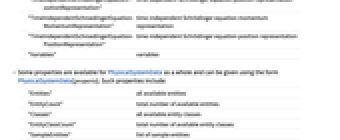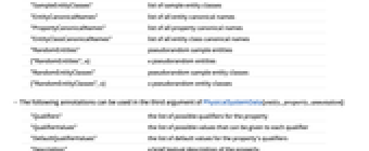 "Entities" all available entities "EntityCount" total number of available entities "Classes" all available entity classes "EntityClassCount" total number of available entity classes "SampleEntities" list of sample entities "SampleEntityClasses" list of sample entity classes "EntityCanonicalNames" list of all entity canonical names "PropertyCanonicalNames" list of all property canonical names "EntityClassCanonicalNames" list of all entity class canonical names "RandomEntities" pseudorandom sample entities {"RandomEntities",n} n pseudorandom entities "RandomEntityClasses" pseudorandom sample entity classes {"RandomEntityClasses",n} n pseudorandom entity classes - The following annotations can be used in the third argument of PhysicalSystemData[entity,property,annotation]:
