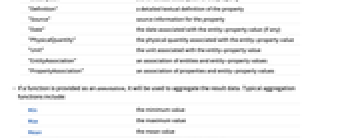 "Qualifiers" the list of possible qualifiers for the property "QualifierValues" the list of possible values that can be given to each qualifier "DefaultQualifierValues" the list of default values for the property's qualifiers "Description" a brief textual description of the property "Definition" a detailed textual definition of the property "Source" source information for the property "Date" the date associated with the entity-property value (if any) "PhysicalQuantity" the physical quantity associated with the entity-property value "Unit" the unit associated with the entity-property value "EntityAssociation" an association of entities and entity-property values "PropertyAssociation" an association of properties and entity-property values - If a function is provided as an annotation, it will be used to aggregate the result data. Typical aggregation functions include: